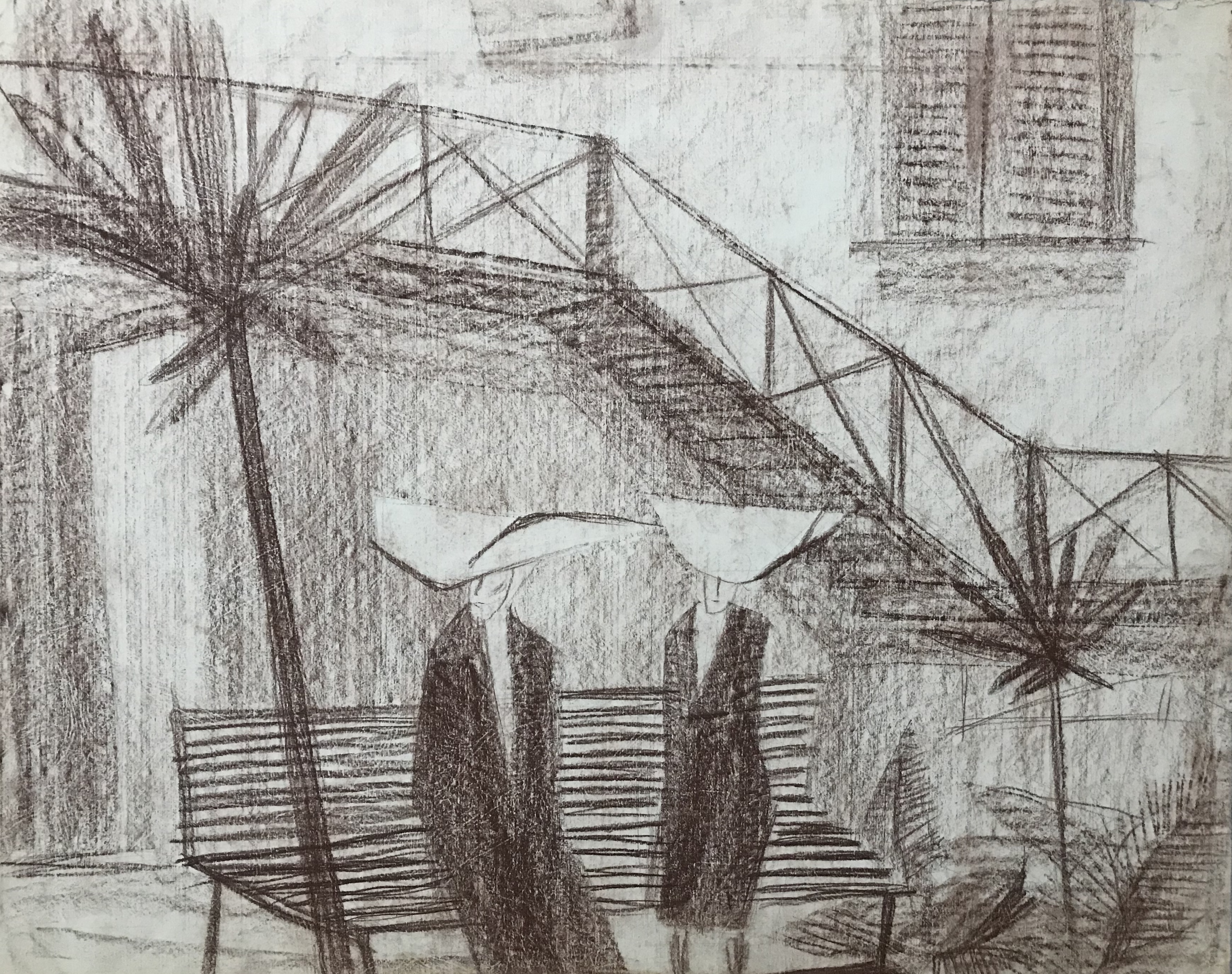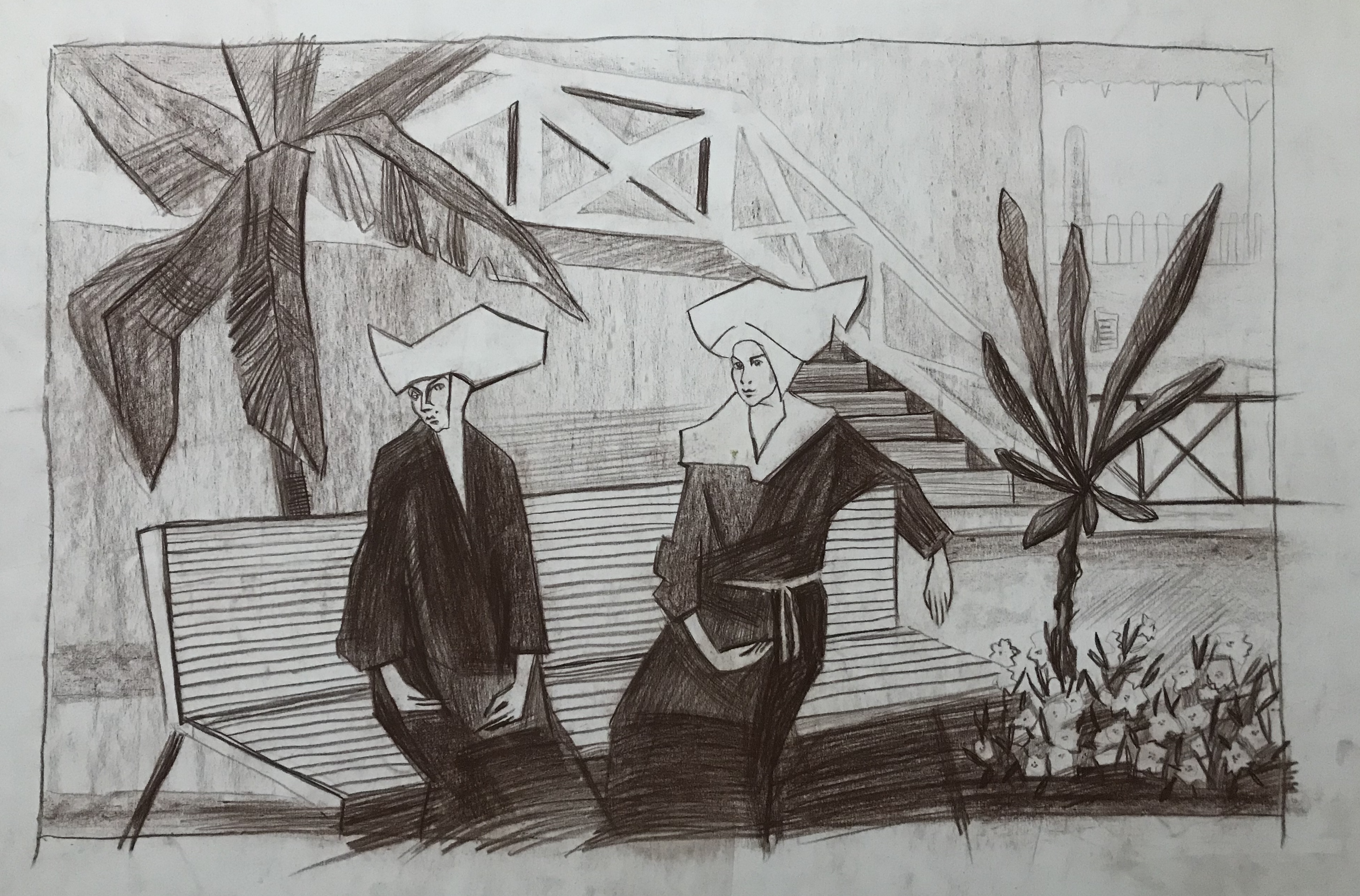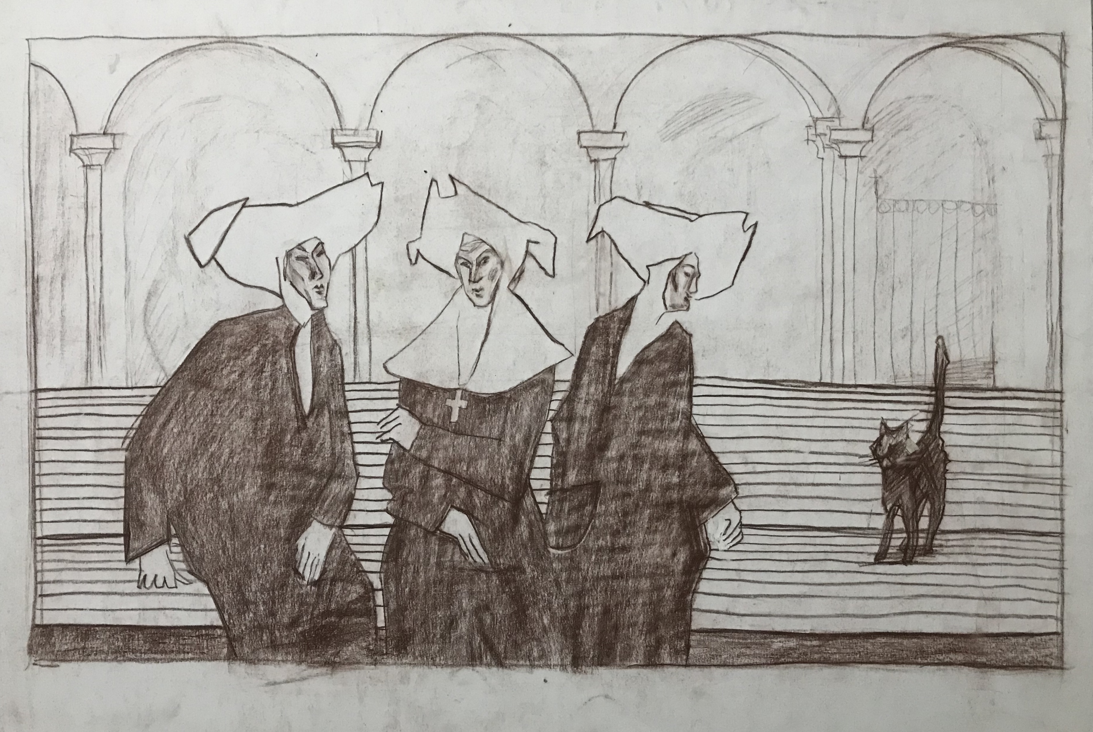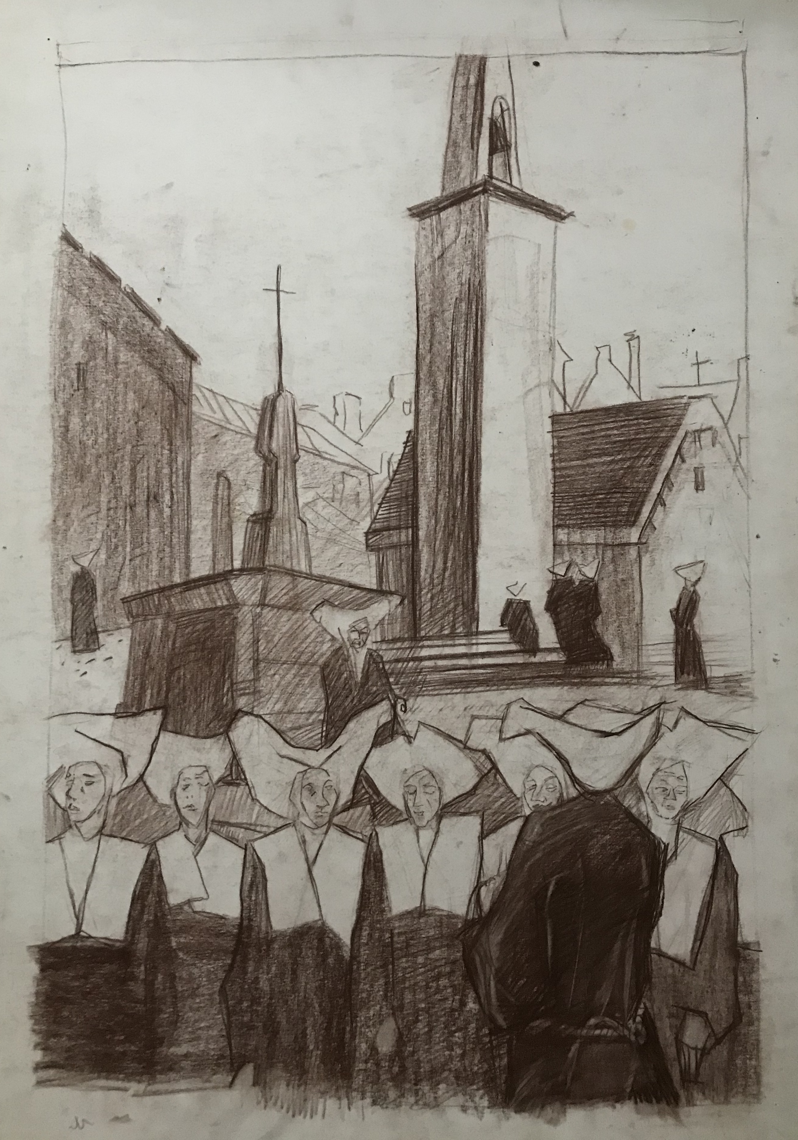 Nuns at noon, dessins préparatoires au crayon sépia sur papier, dimensions variables, 2001