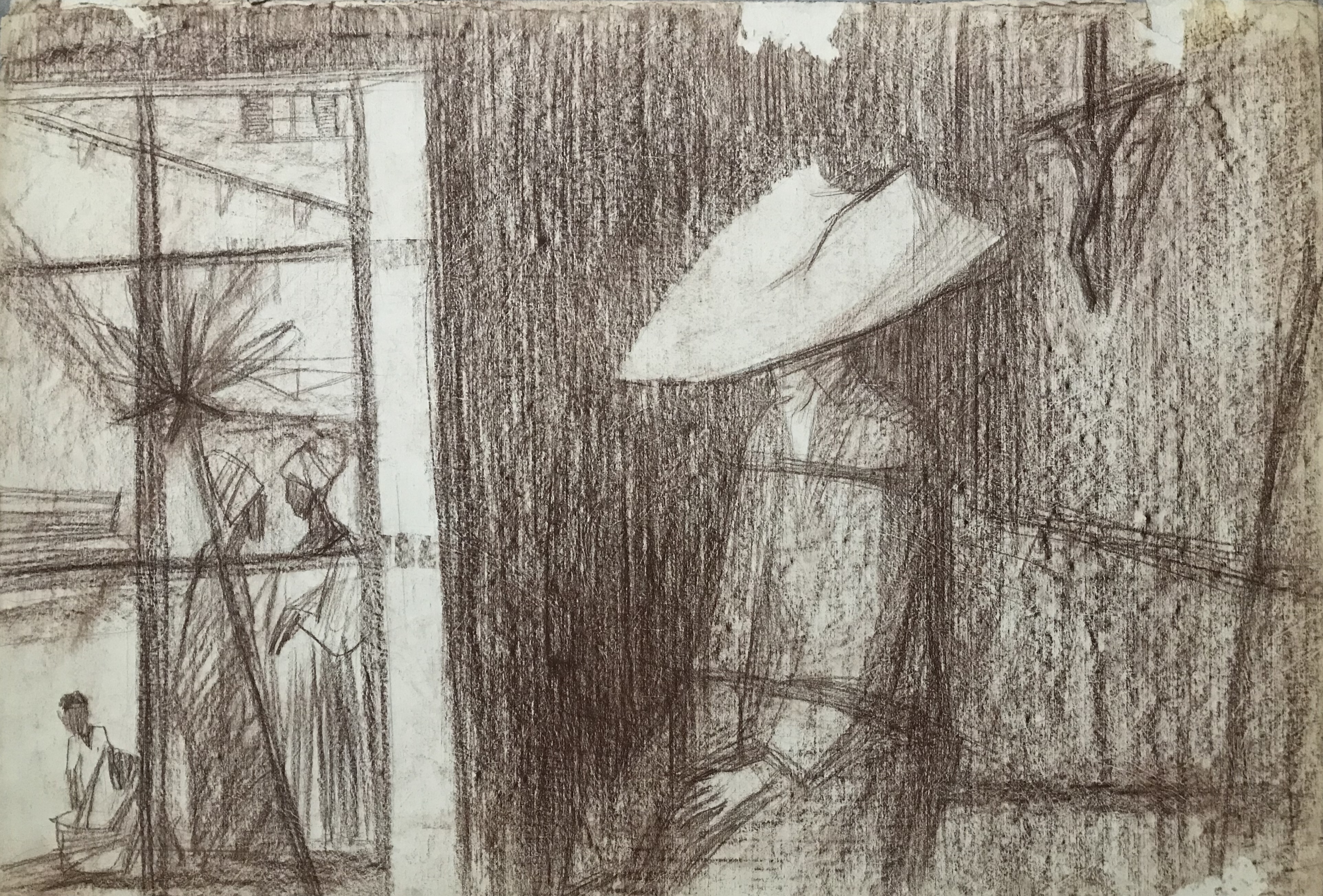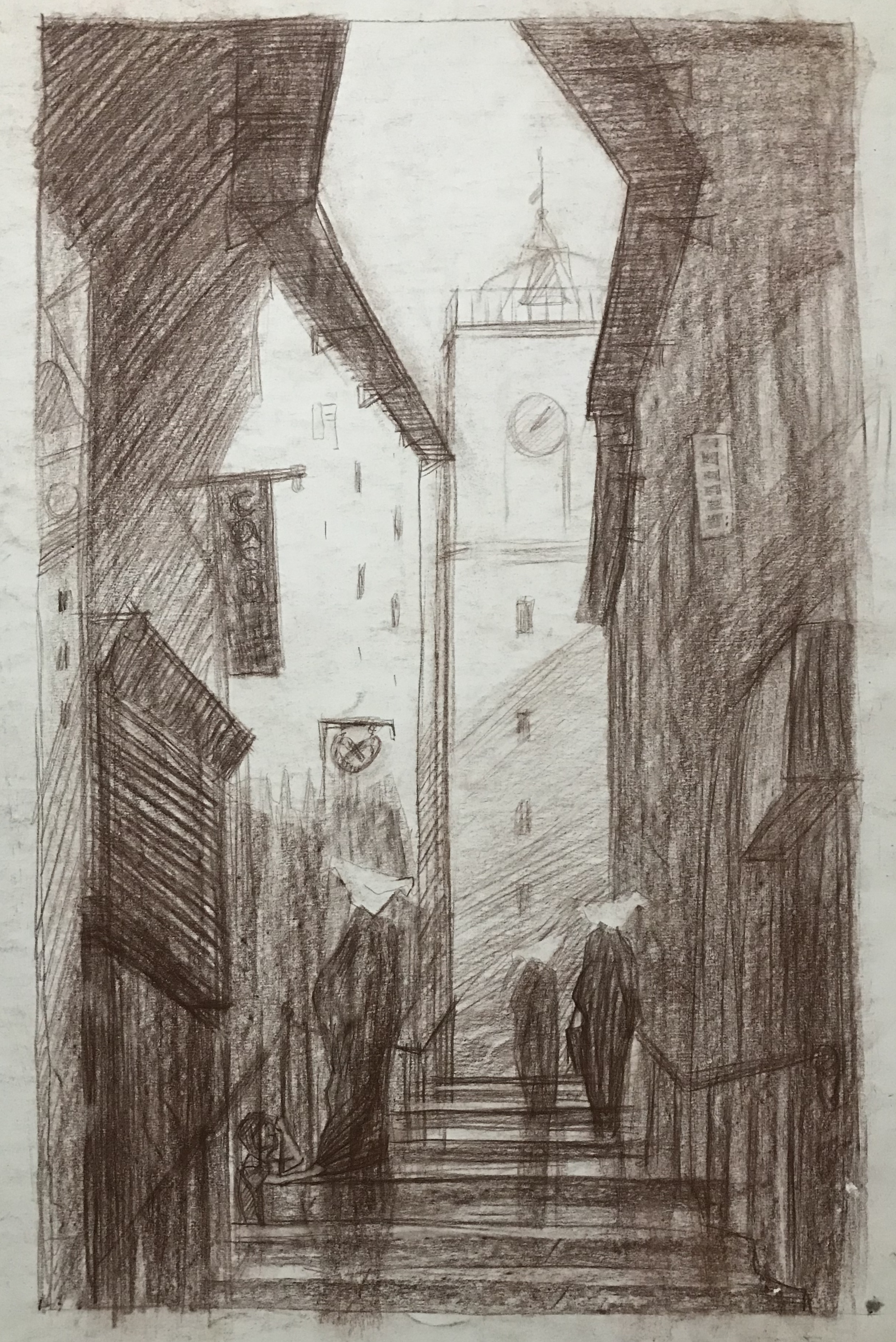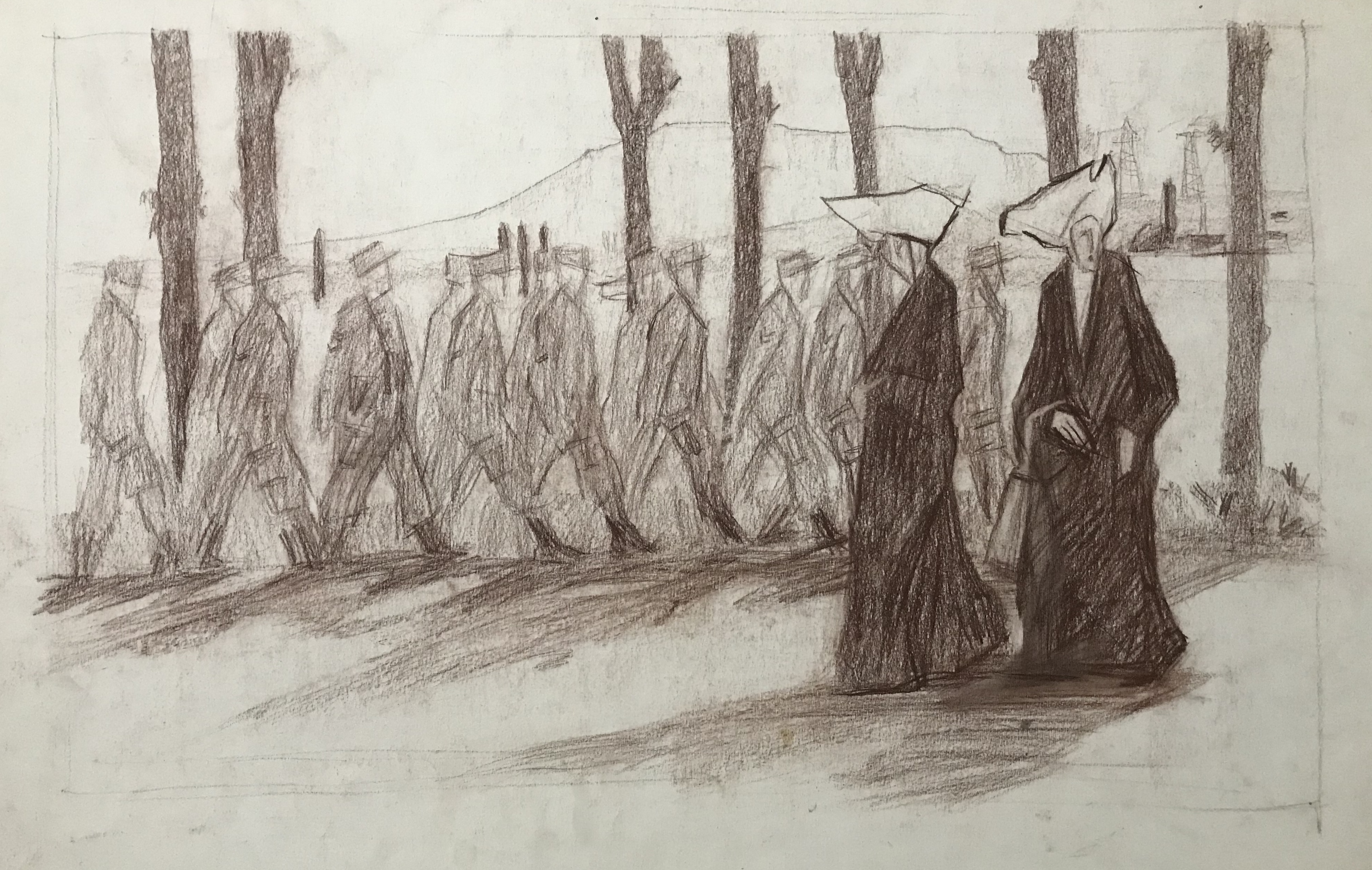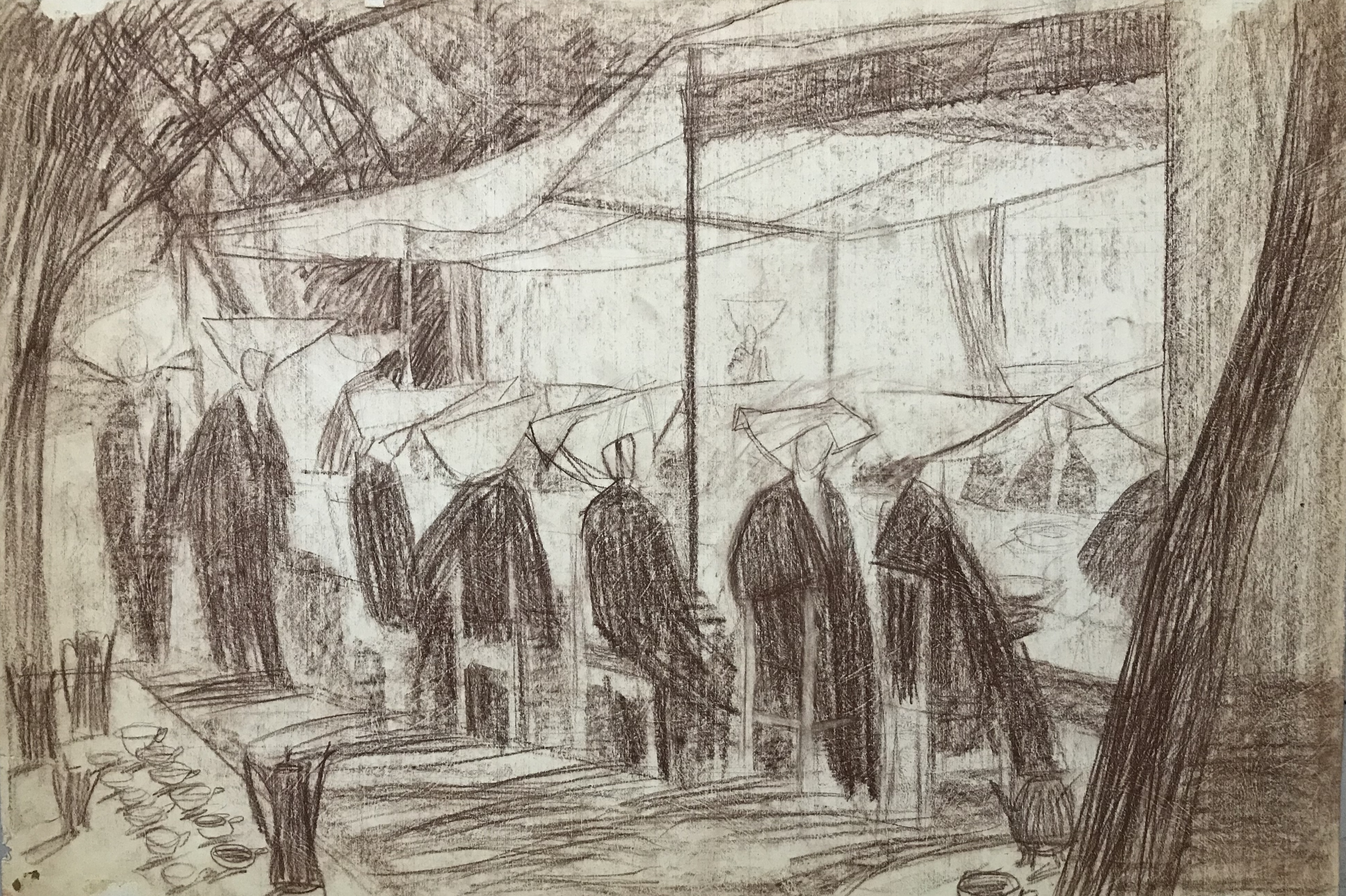 Nuns at noon, dessins préparatoires au crayon sépia sur papier, dimensions variables, 2001